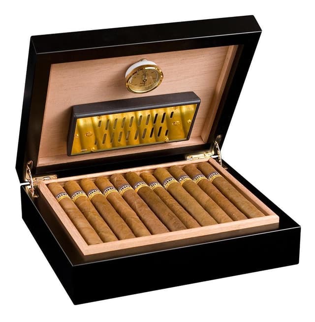 Produktspecifikationer: • Kapacitet: 30 cigarrer • Filtbotten • Yttermått:L:26.5 B:22.5 H:7.5 cm • Förkalibrerad hårhygrometer med hög precision, optimerad för cigarrförvaring. • Guldplaterad polymerbaserad Adorini Delux fuktare med justerbar ventilation för en optimal reglering av fuktighetsnivån. • Unika ventilationskanaler (”RibTech”) för förbättrad luftcirkulation inuti humidoren. • Extra stark stomme och extra stark insats av Spanskt cederträ. • Hygrometer och fuktare fixerade med magnet för att dölja metallplatta under träfaner. • Innovativt avdelningssystem för flexibel åtskiljning. • Etikett klipps för avdelare. • Extra starka gångjärn -24K guldplettering och polerade. • Livslång garanti.