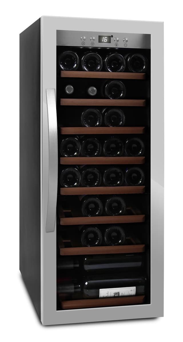 mQuvée - WineExpert 43 Stainless - Fristående vinkyl Fristående vinkyl som lever upp till sitt namn! Med WineExpert 43 kan du känna kvalitén. De utdragbara trähyllorna ligger på räls för extra stabilitet och dras ut med en mjuk rörelse. Vinkylens funktioner styrs med äkta knappar och inställningarna visas på digital skärm. Vinkylen är utformad för att passa alla typer av flaskor, så att du också kan få plats med ditt mousserande vin.