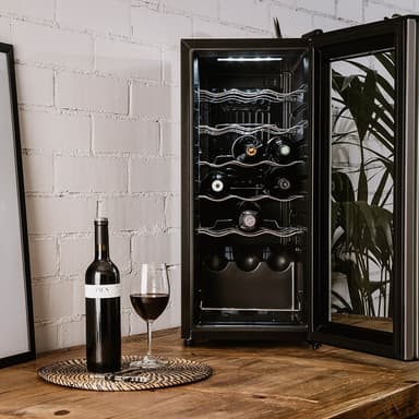 Med antivibrationssystem och dubbel glasdörr helt i svart som förhindrar att vinet solens strålar eller utomhustemperaturen kommer in.